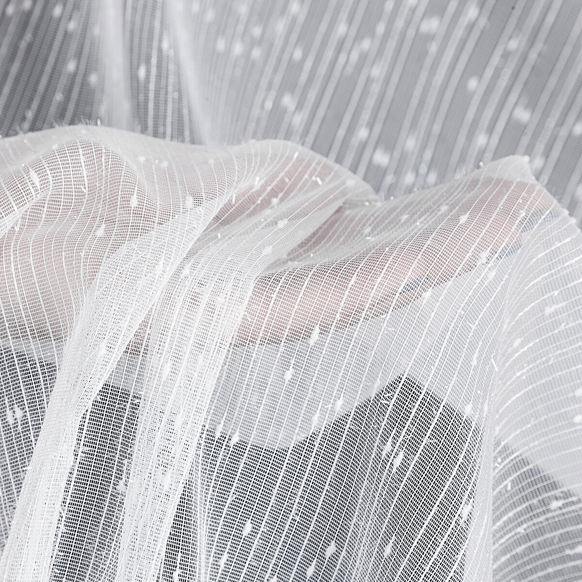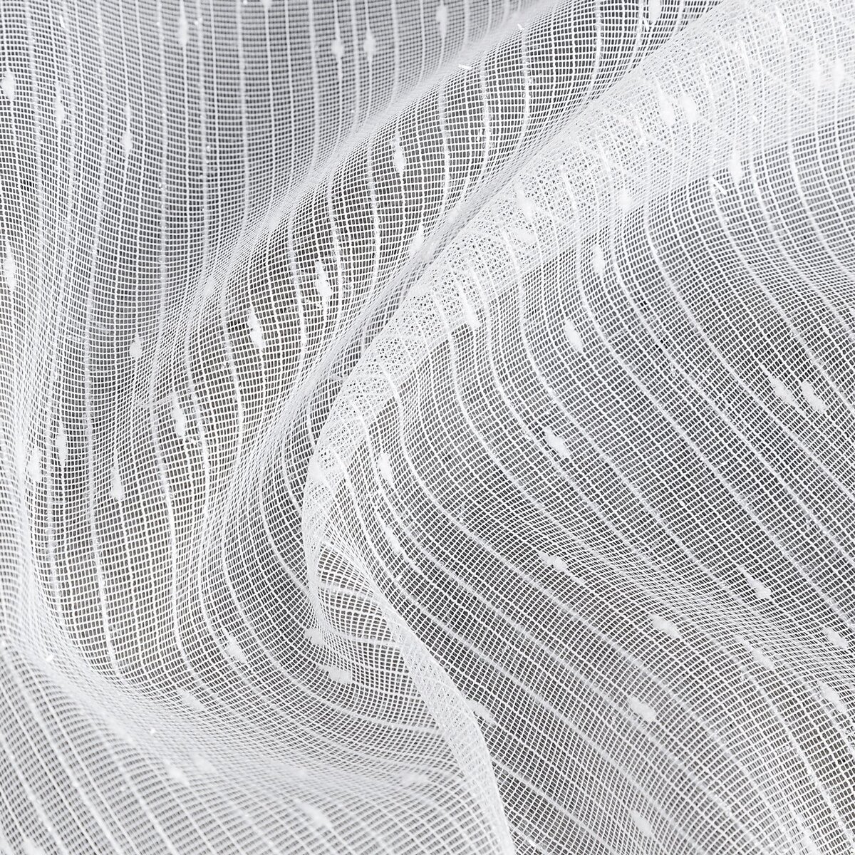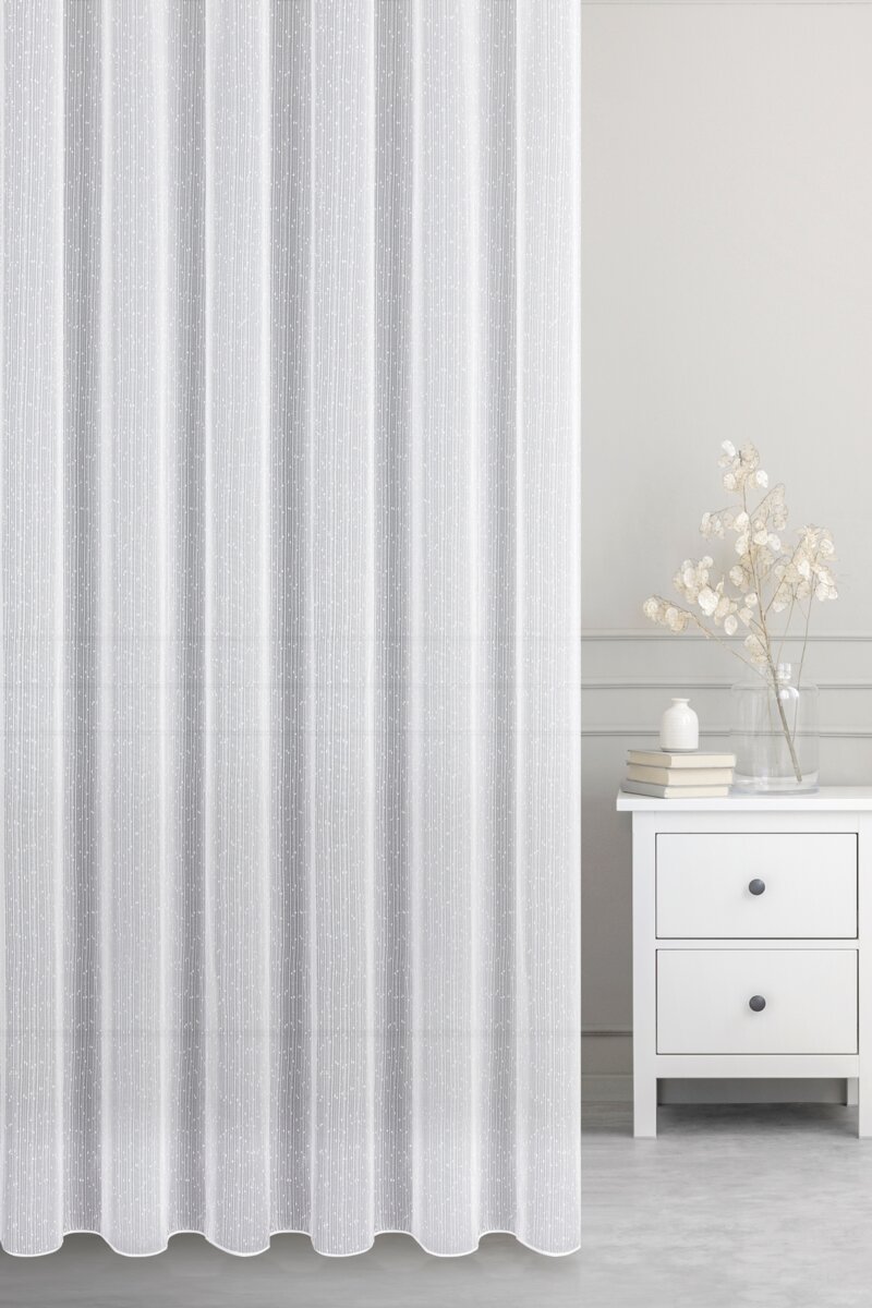 Elegancka i bardzo lekka firana wykonana z dekoracyjnej tkaniny Eurofirany – siatka z nicią moherową o wzorze deszczyk. Delikatna, lekko błyszcząca struktura materiału subtelnie odbija światło, dzięki czemu firana prezentuje się niezwykle elegancko i nadaje wnętrzu lekkości.