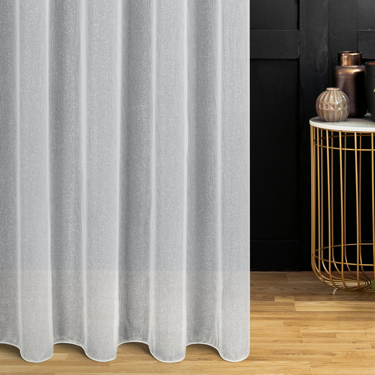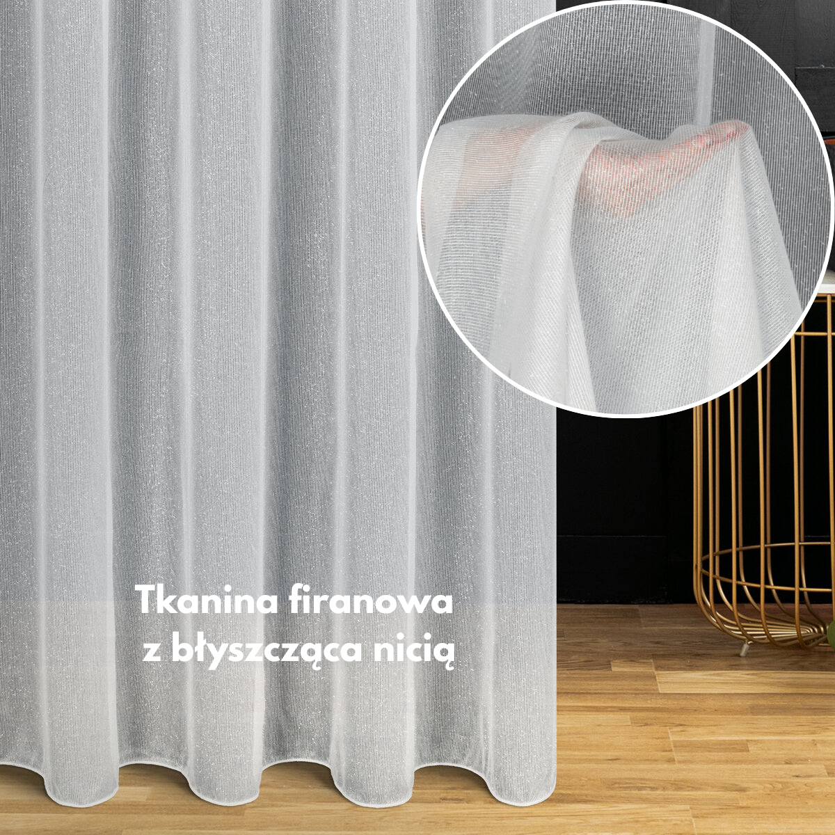 Elegancka firana wykonana z wysokiej jakości tkaniny Eurofirany z dekoracyjną włochatą nicią. Delikatnie błyszcząca struktura materiału oraz subtelna, miękka faktura sprawiają, że firana pięknie odbija światło i nadaje wnętrzu lekkości oraz elegancji.