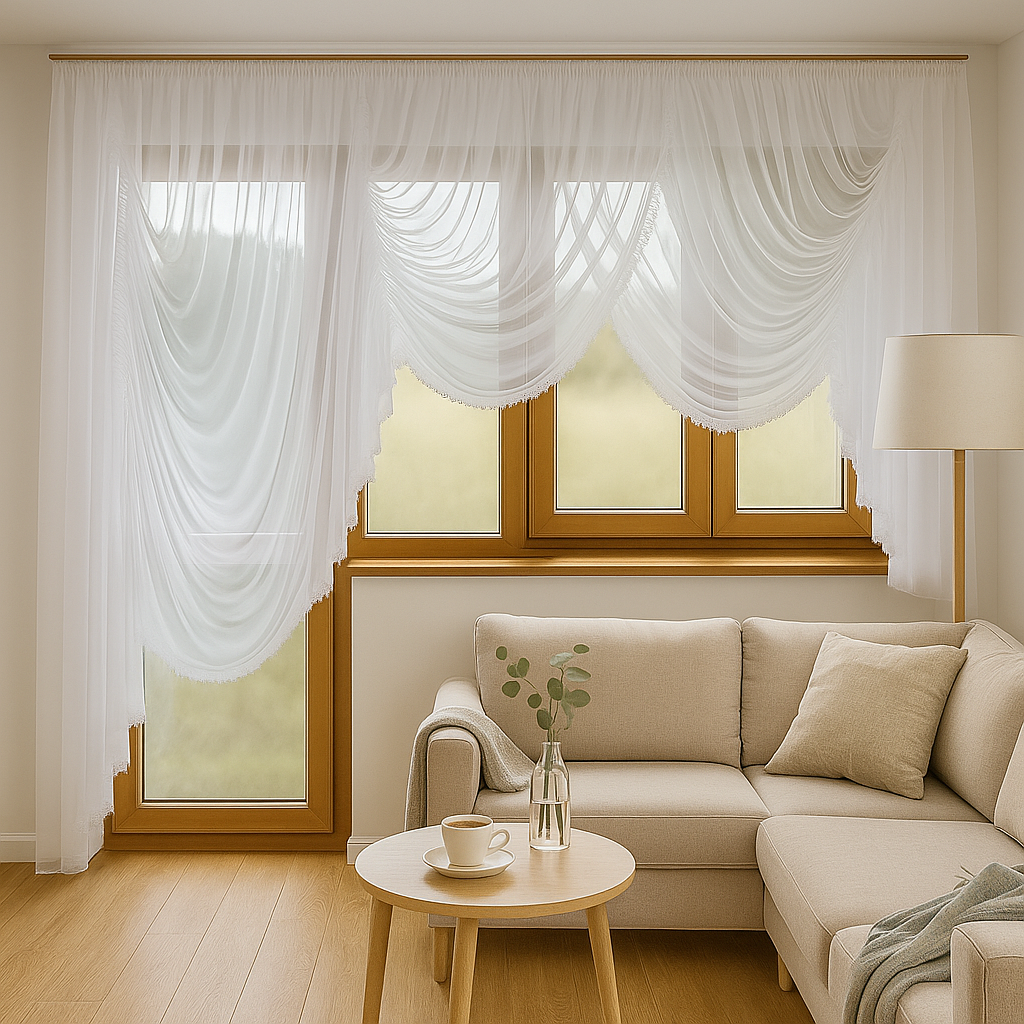 ✔️ Zestaw 2-częściowy – firanka krótka + firanka balkonowa.