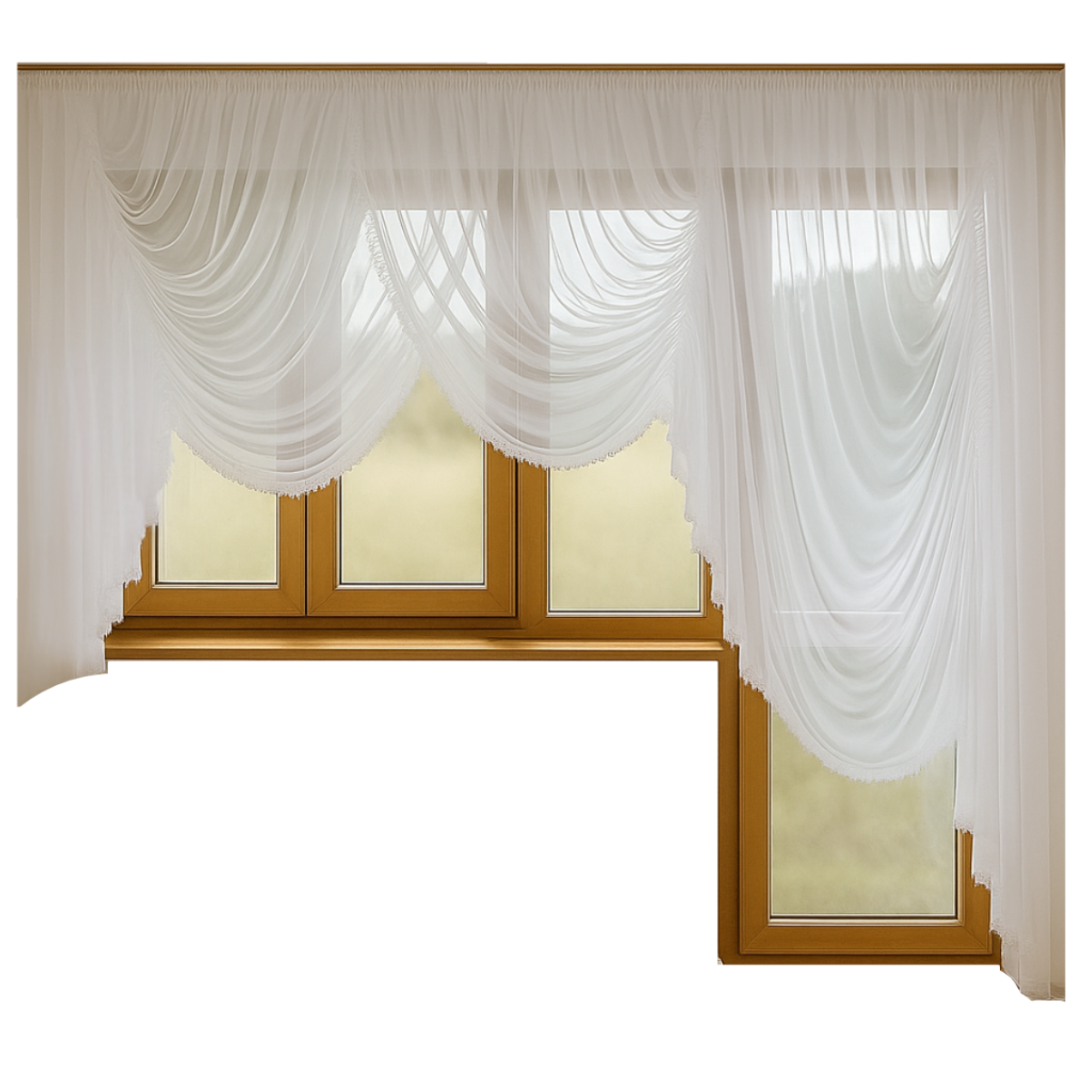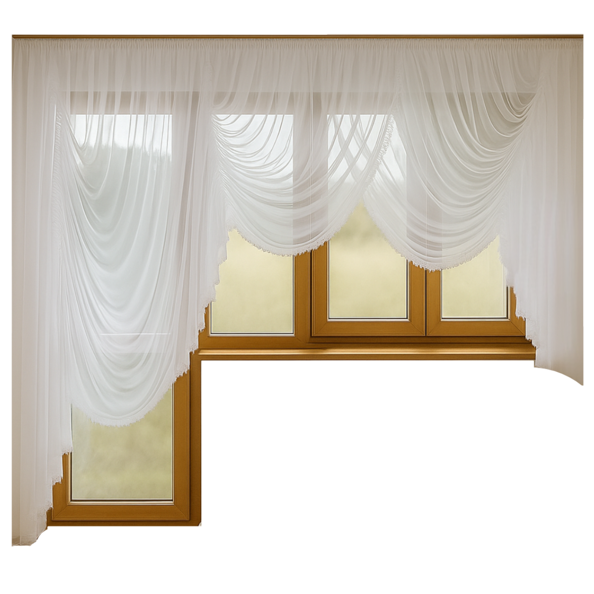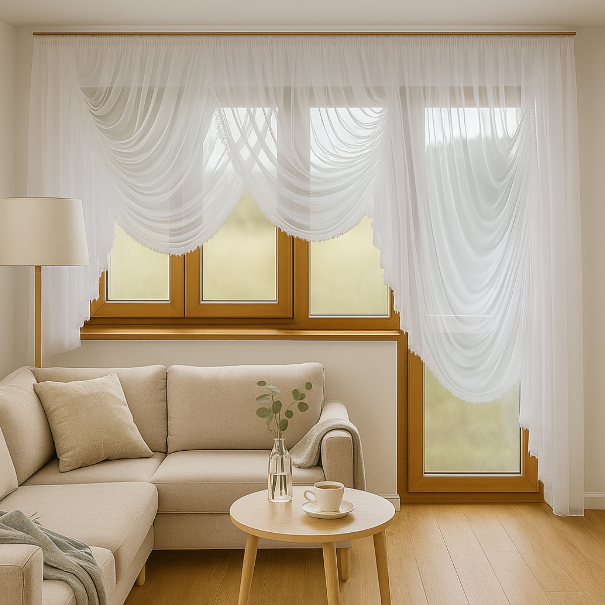 Przepiękny komplet balkonowy wykonany z wysokiej jakości woalu białego, który pięknie rozprasza światło i nadaje wnętrzu lekkości.