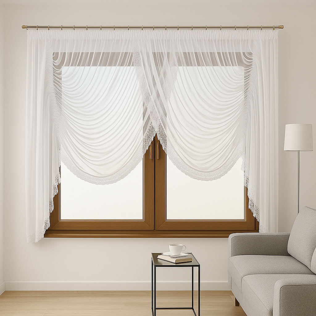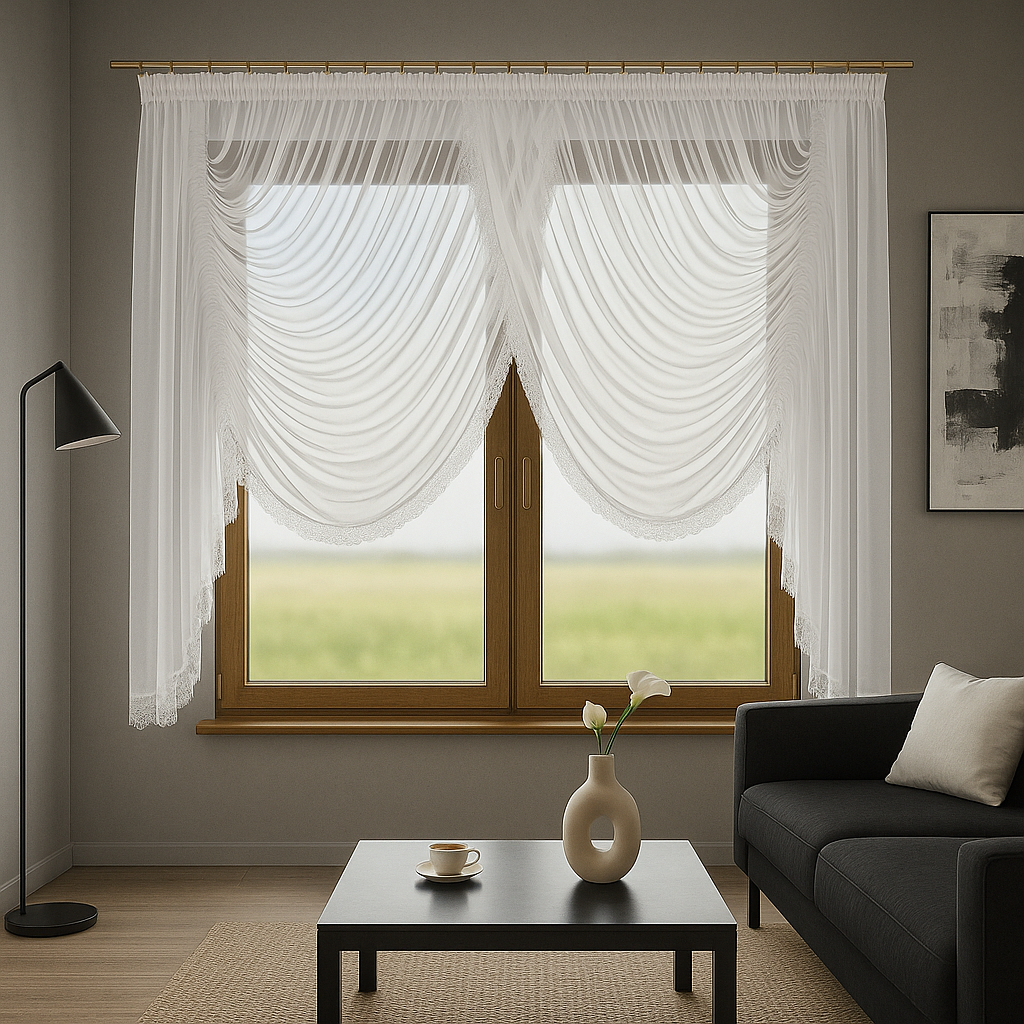 Delikatna tkanina pięknie przepuszcza światło, a ozdobna gipiura nadaje wnętrzu luksusowego, a zarazem przytulnego charakteru.