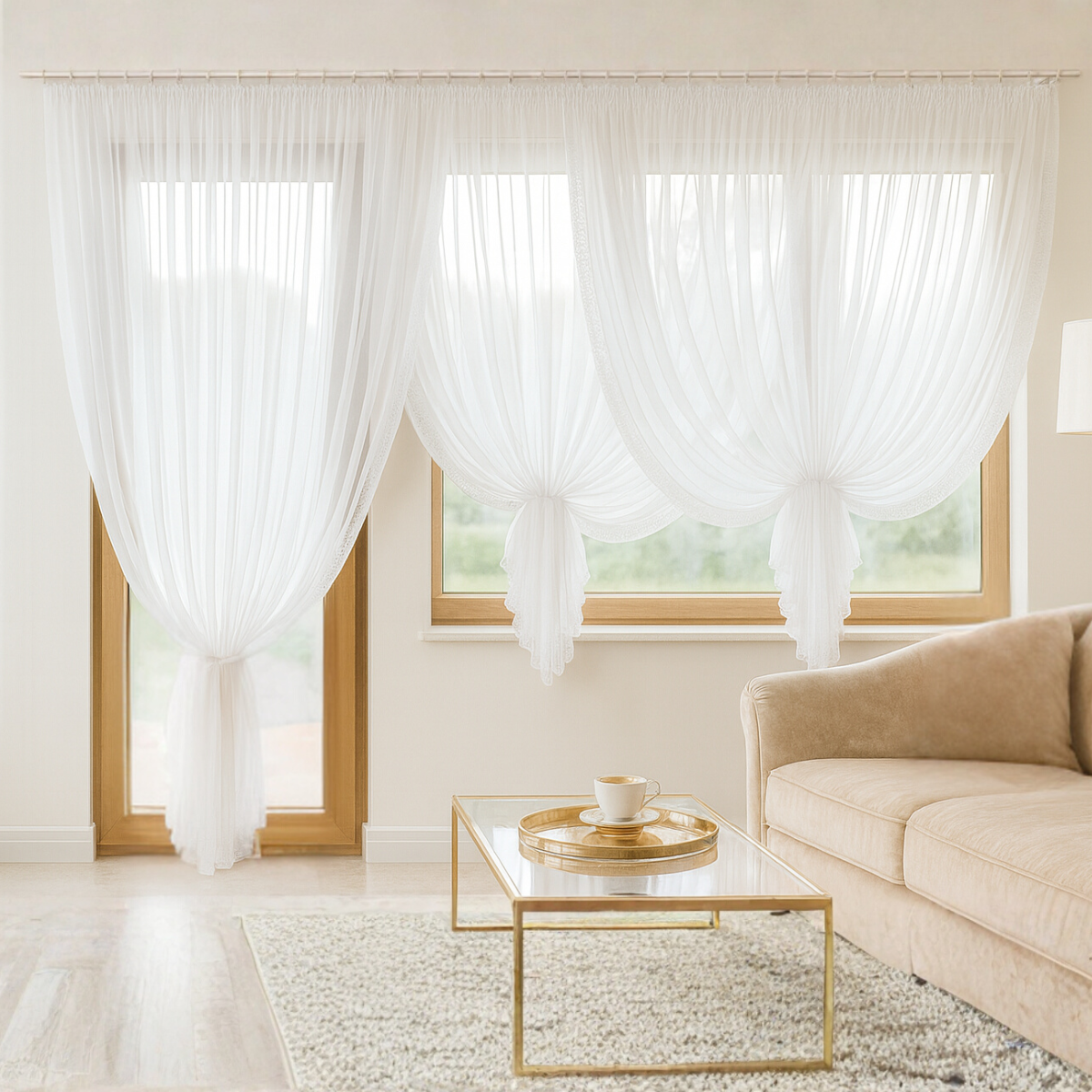 Całość została zaprojektowana tak, aby idealnie pasowała na karnisz 2,8–3,5 m, tworząc elegancką i lekką aranżację okienną.
