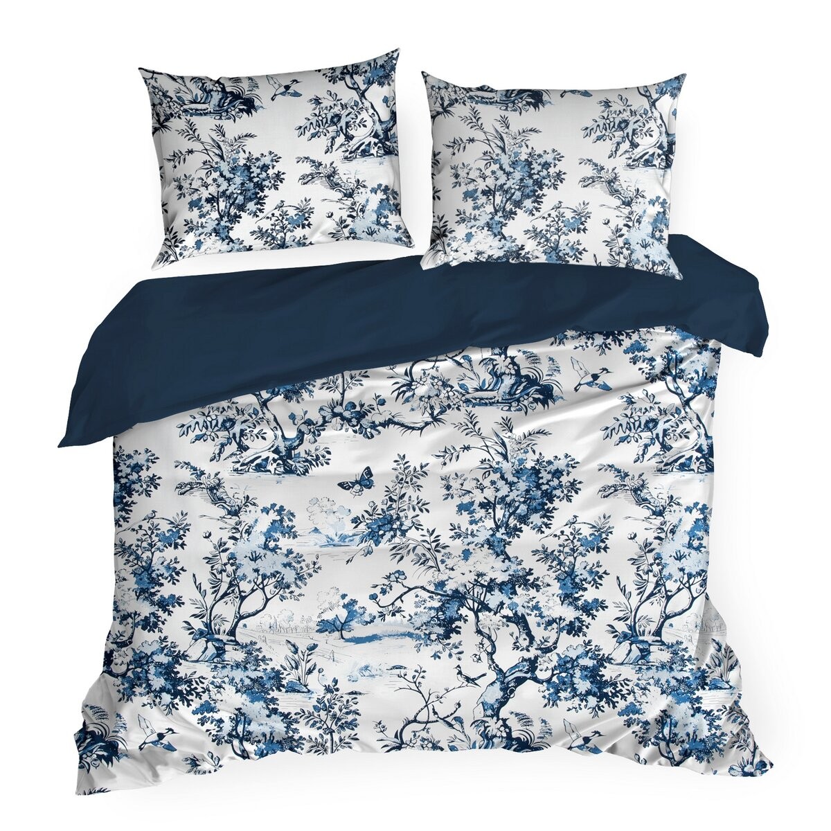 Pościel wyróżnia się efektownym wzorem inspirowanym naturą i sztuką orientalną – połączenie granatu i bieli tworzy elegancką, wyrazistą kompozycję, która doskonale podkreśli charakter sypialni.