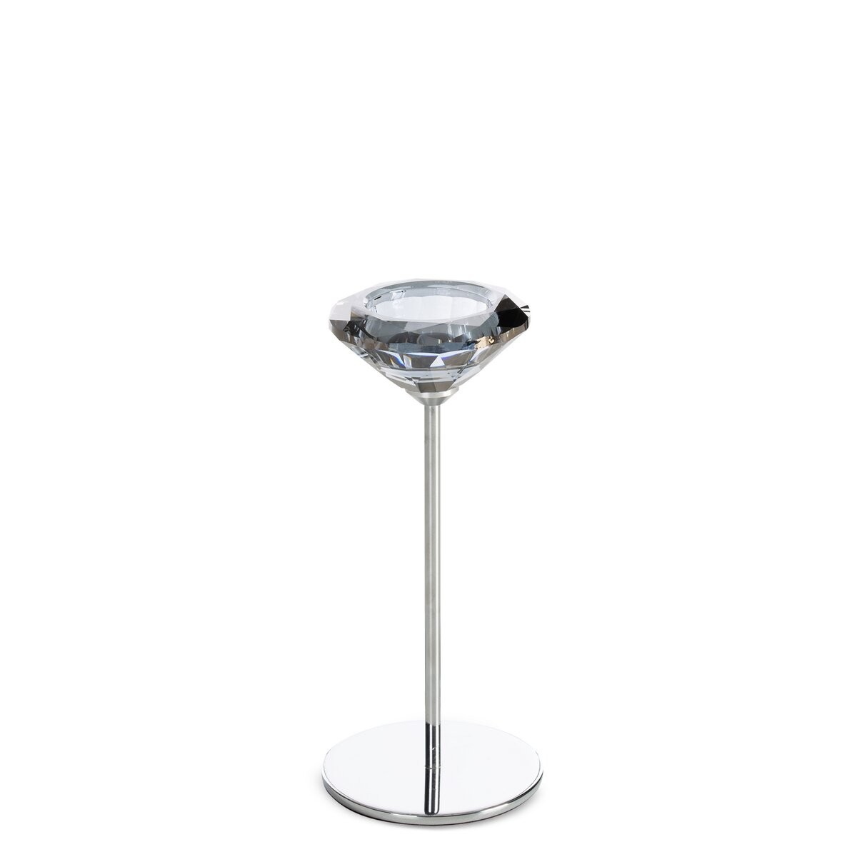 Elegancki świecznik dekoracyjny wykonany z kryształu i metalu w srebrnym wykończeniu. Szlifowana, efektowna głowica pięknie odbija światło, nadając wnętrzu wyjątkowego blasku.