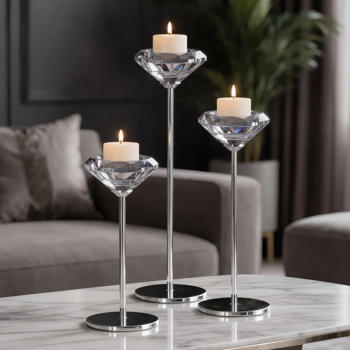 Nowoczesny świecznik dekoracyjny łączący transparentny kryształ z eleganckim, srebrnym metalem. Jego smukła i lekka forma sprawia, że doskonale wpisuje się zarówno w nowoczesne, jak i klasyczne aranżacje wnętrz.