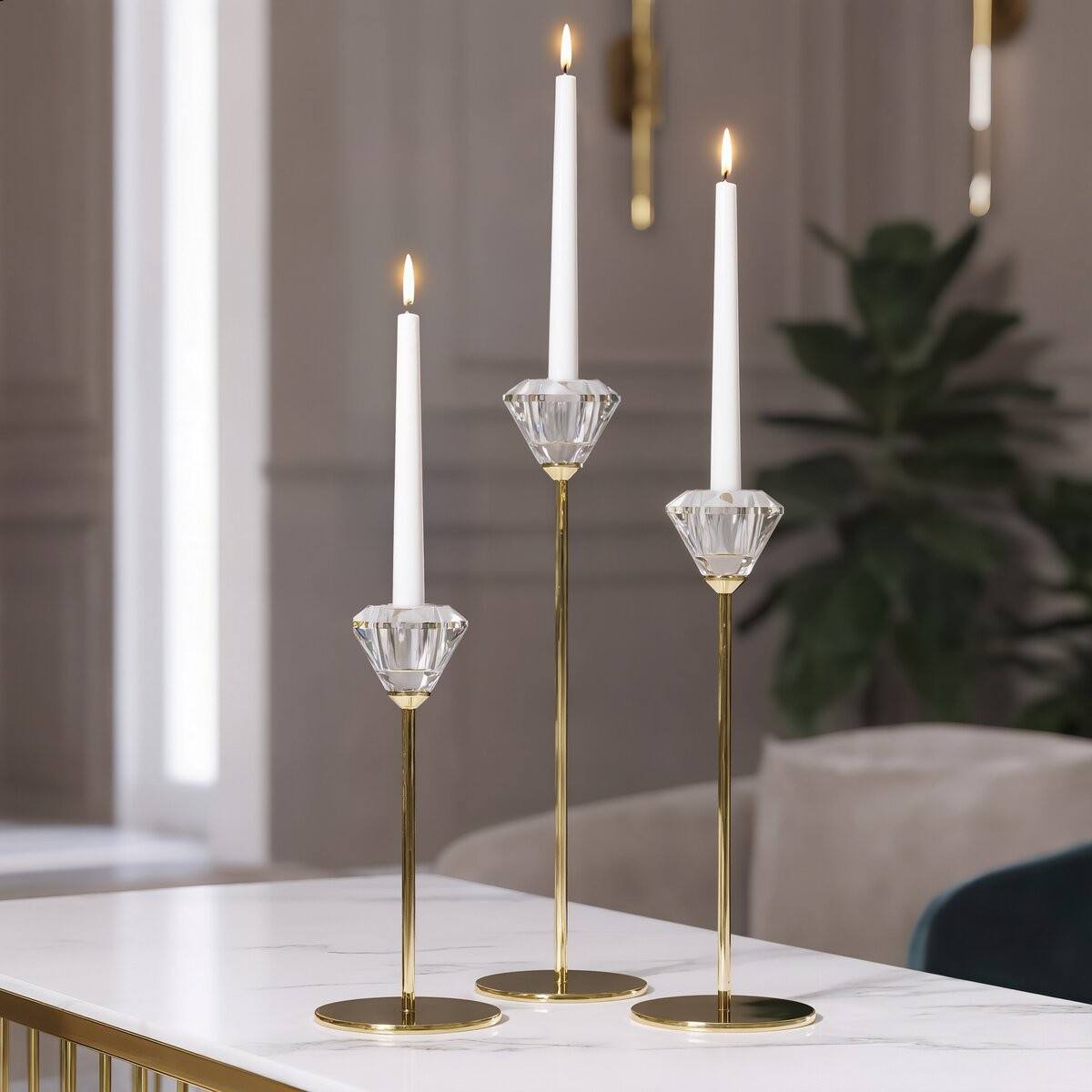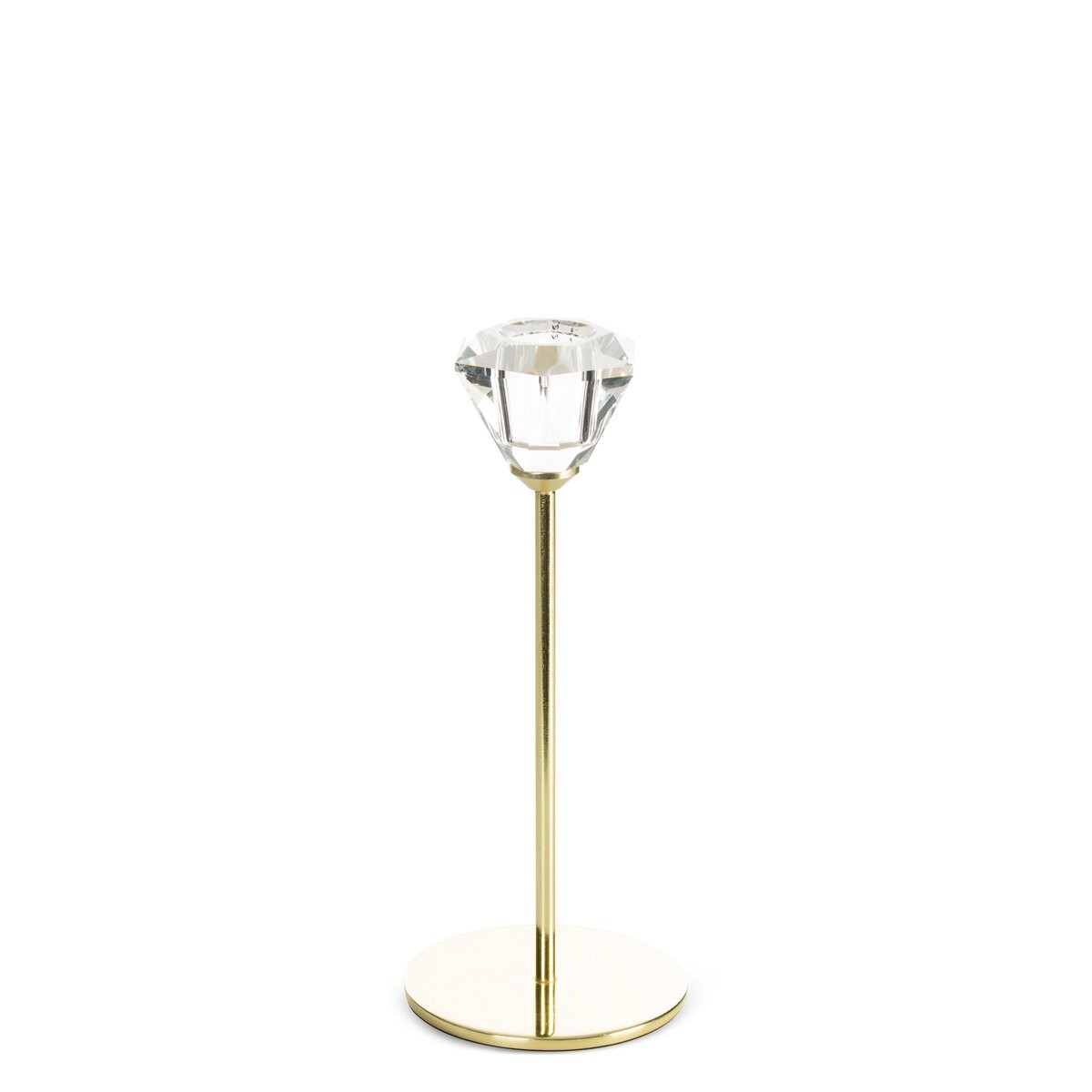 Stylowy świecznik dekoracyjny wykonany z połączenia kryształu i metalu w złotym wykończeniu. Smukła forma i szlifowana głowica pięknie odbijają światło, tworząc wyjątkowy klimat.