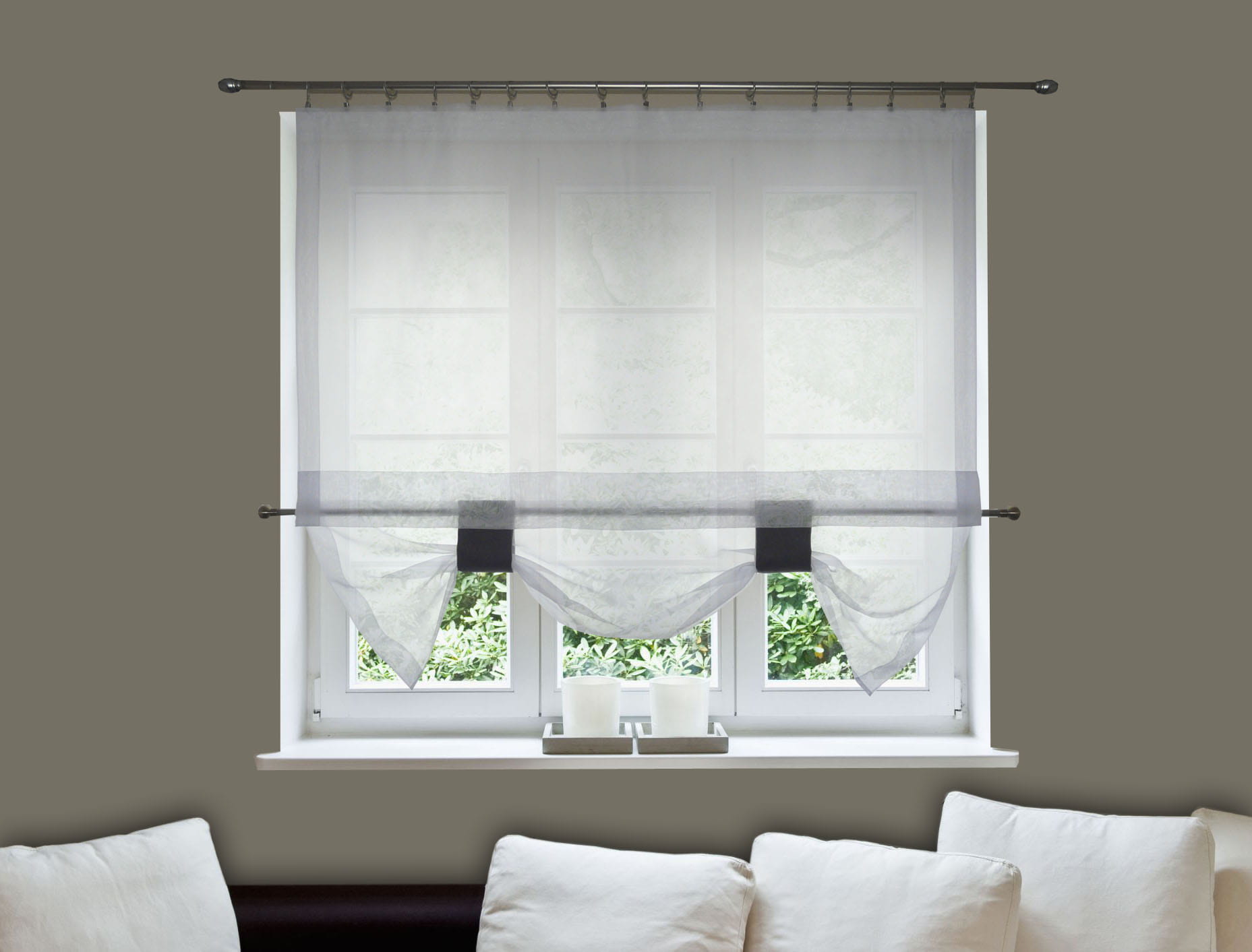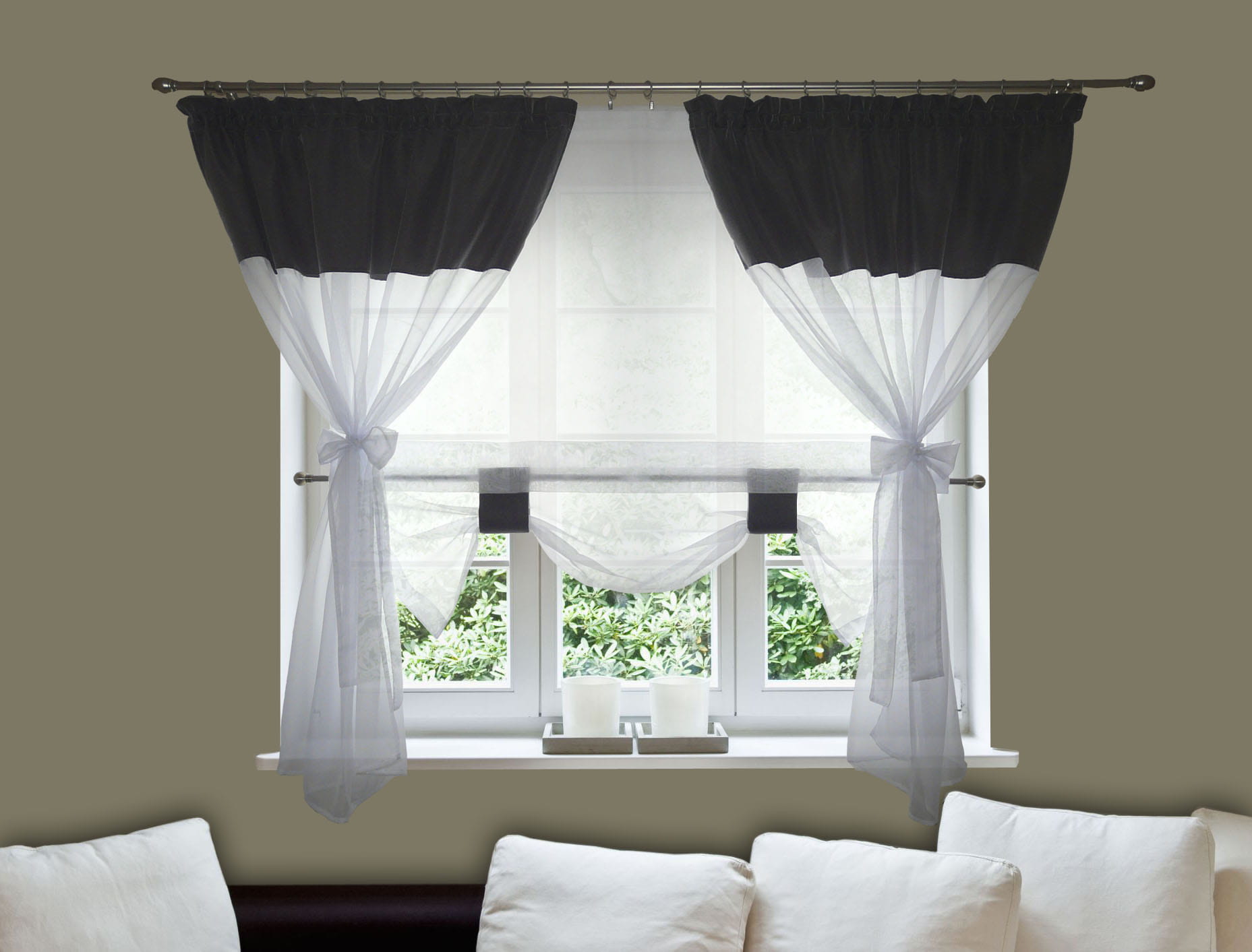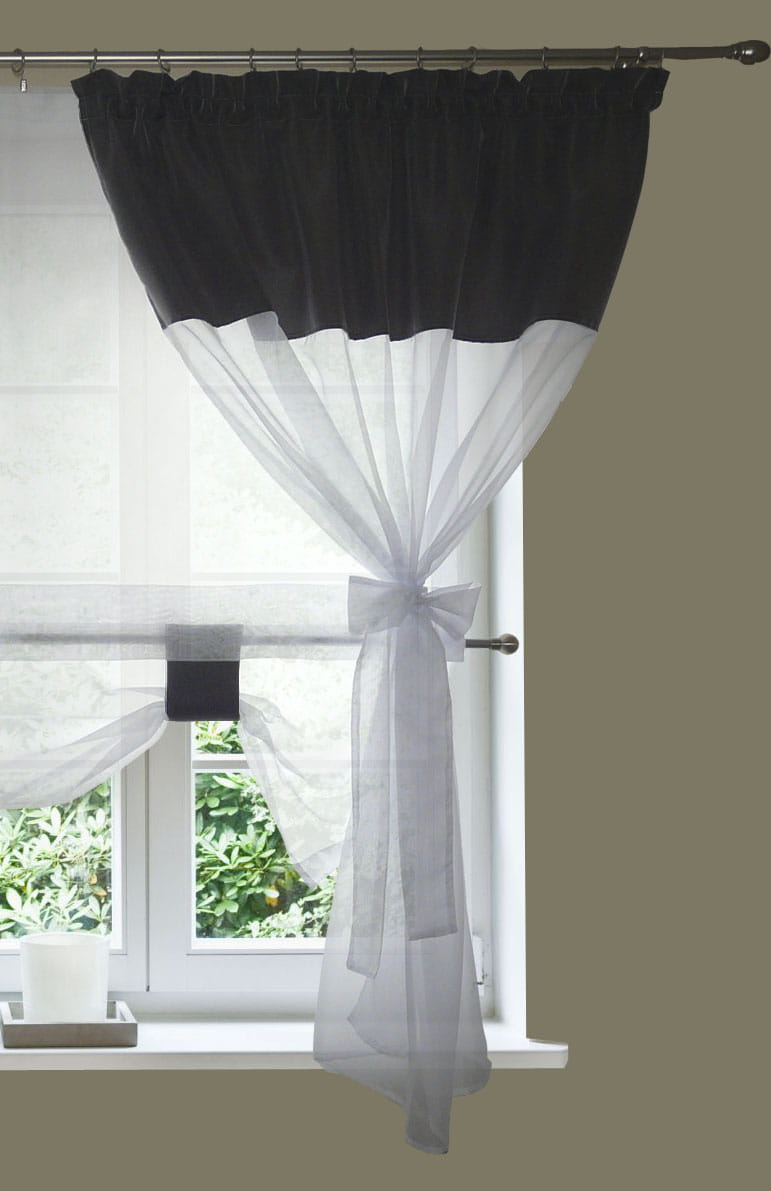 - dwóch zasłonek uszytych z woalu białego wraz z dodatkiem tkaniny w kolorze szarym